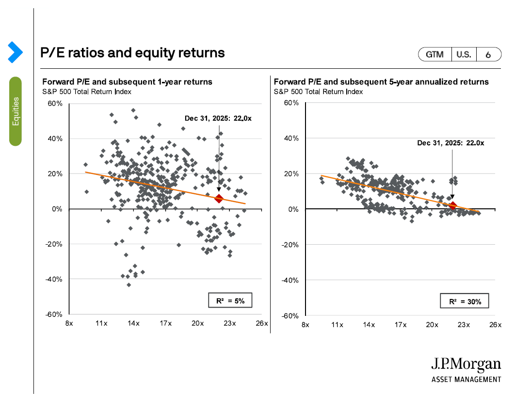 Returns are 12-month and 60-month annualized total returns, measure monthly, beginning 12/31/1993. R2 represents the percent of variation in total return that can be explained by forward P/E ratios. The forward P/E ratio is the most recent S&P 500 index price by consensus analyst estimate for earnings in the next 12 months, provided by IBES since December 1993 and FactSet since January 2022. Past performance is no guarantee of future results. Guide to the Markets - U.S. Data are as of December 31, 2025.